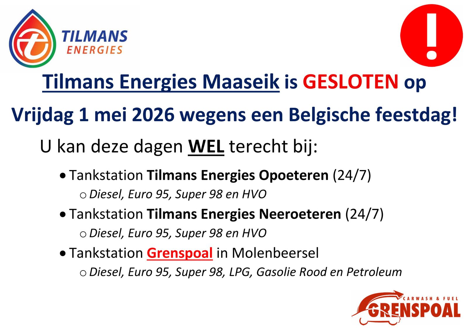 - Tankstation Tilmans Energies Neeroeteren (Maaseikerlaan 109, Neeroeteren) voor Euro 95, Super 98, Diesel en HVO